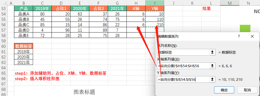 Step1:添加辅助列,包括占位、X轴、Y轴、数据标签。