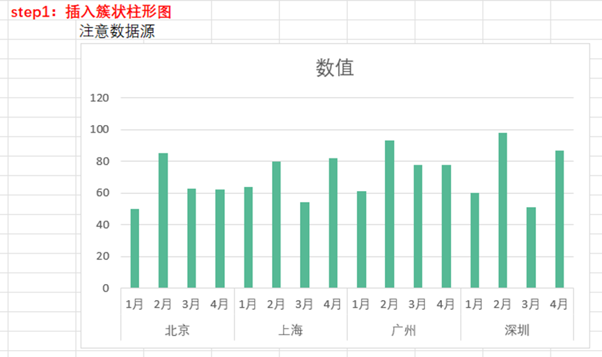 Step2:插入簇状柱形图。同样需要注意的是,原始数据数值列是不需要插入到图表种的。