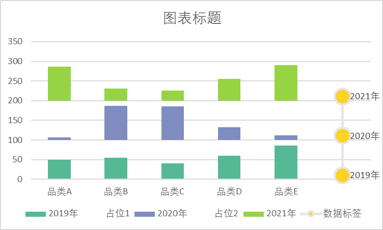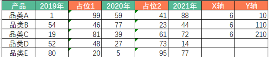这里观察到每年的数据最大不超过100,那么占位的数据可以用100-当前数据。X轴和Y轴的辅助列是用来做最后的年份标签的。X轴数据为6,是因为X轴从品类A到品类E是5个计数单位,第6个计数单位刚好就可以给到年份了。Y轴的数据则可以根据具体数值来填。