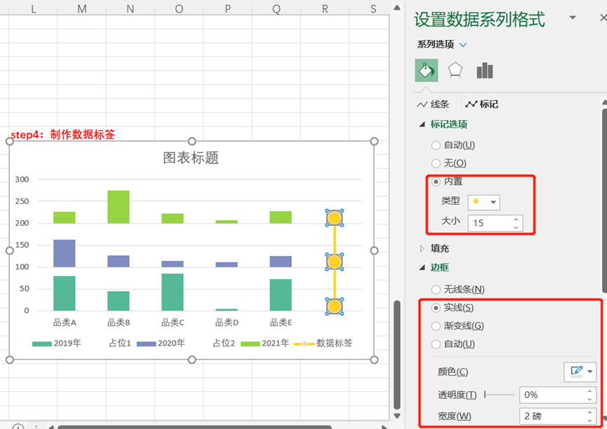 点击散点图的点,设置数据系列格式,在标记处,将标记选项更改为内置,15大小,边框为灰色,宽度2磅。