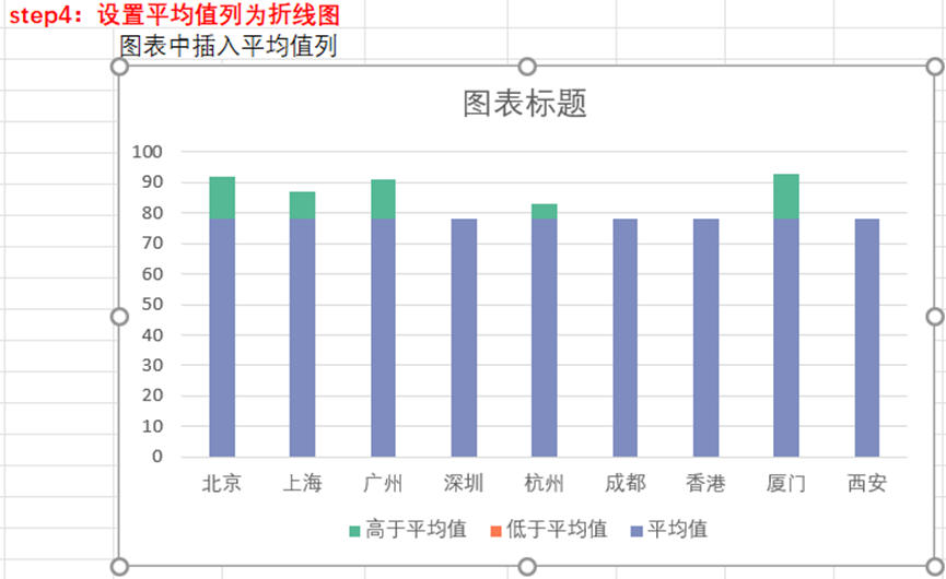 Step2:对城市、高于平均值、低于平均值三列数据插入簇状柱形图。