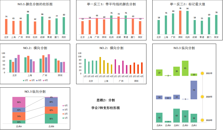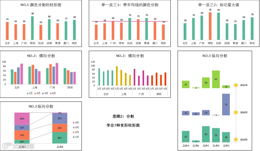 通过分割的思路,也可以学会7种变形柱形图,分割,包括颜色的分割、横向分割和纵向分割3种。