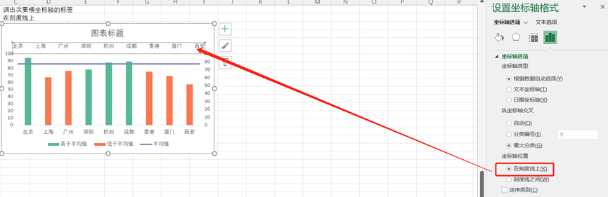 点击上方的次要横坐标轴,在坐标轴选项里,设置坐标轴的位置为在刻度线上,这样平均值线就从头贯穿到尾了。