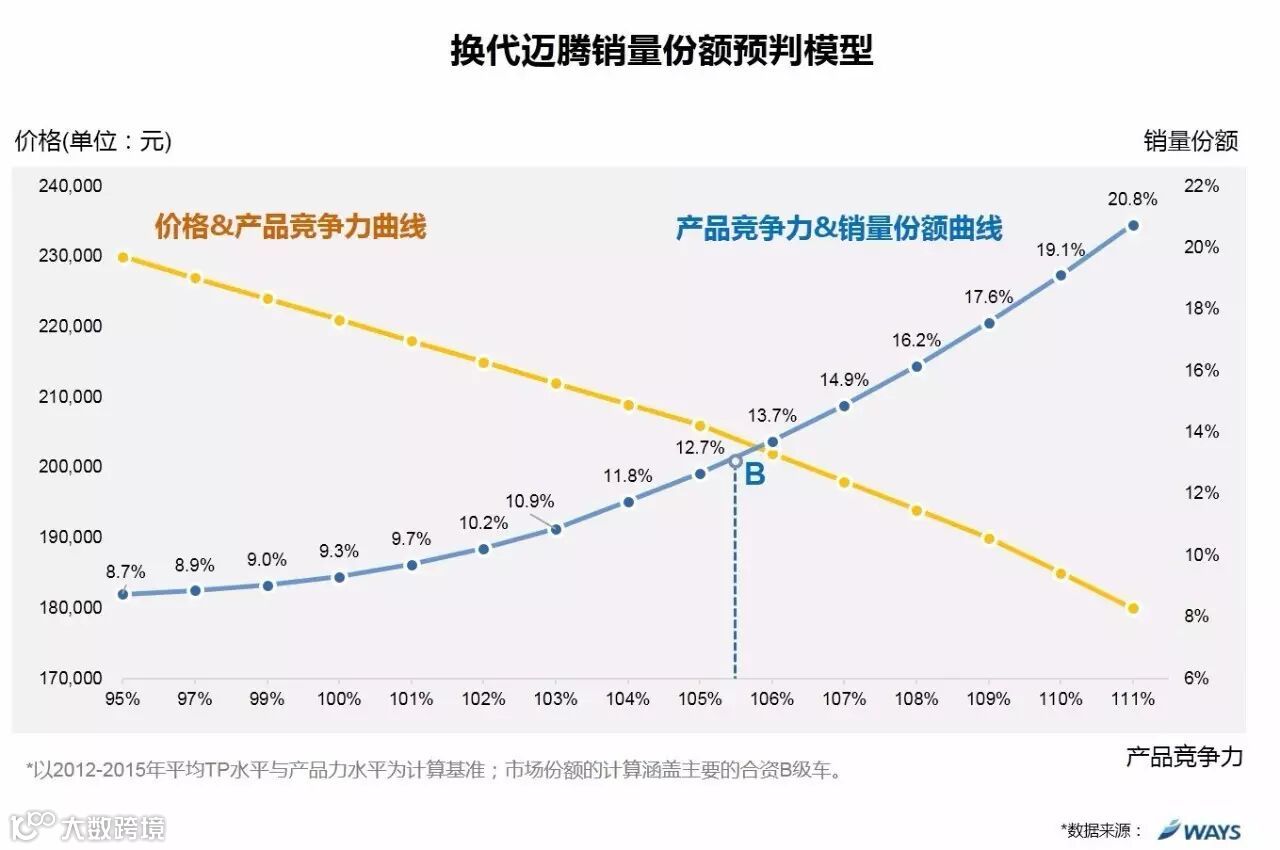 另外,以迈腾及细分市场历年的TP、产品竞争力和销量份额为基础,还可进一步建立分析模型。假定换代迈腾上市半年后进入稳定期,成交价格取2015年平均水平(即折扣率约为10%),且市场环境未发生明显变化,则其产品竞争力为105.4%,所对应的销量份额预计为13.4%(较2015年上升2.3%)。