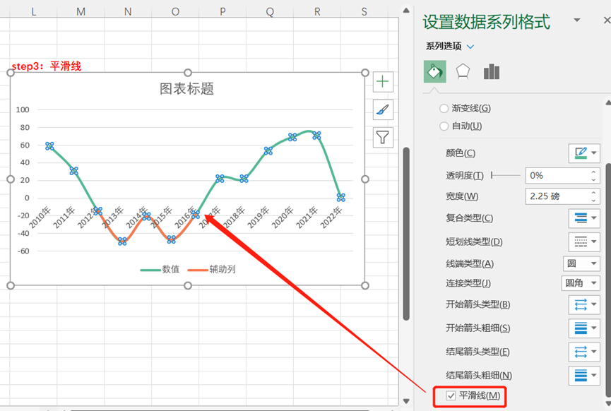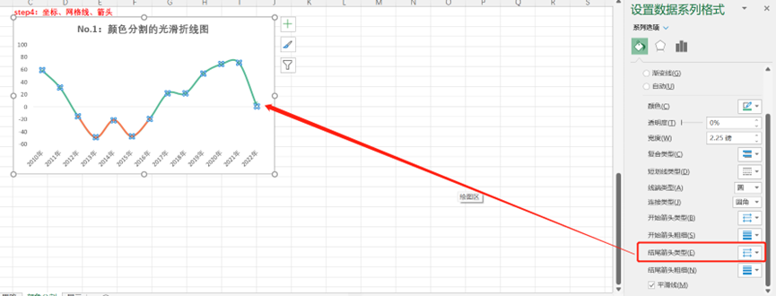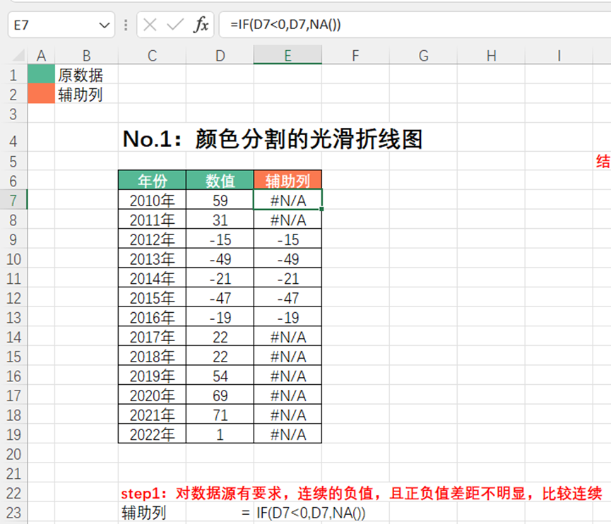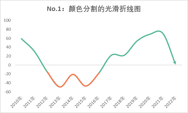 通过颜色区分正负值、且折线光滑的折线图。颜色分割很好理解,就是做辅助列,重点在如何做光滑的折线图。