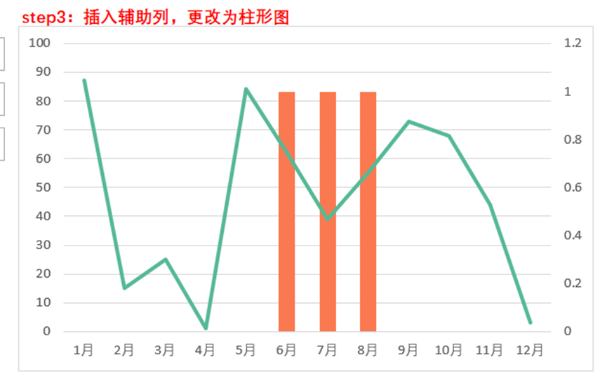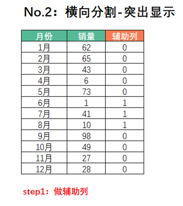 step1:做辅助列第一步,做辅助列,想让678三个月的背景突出显示出来,就在辅助列的678三个月填入1,其余填0.
