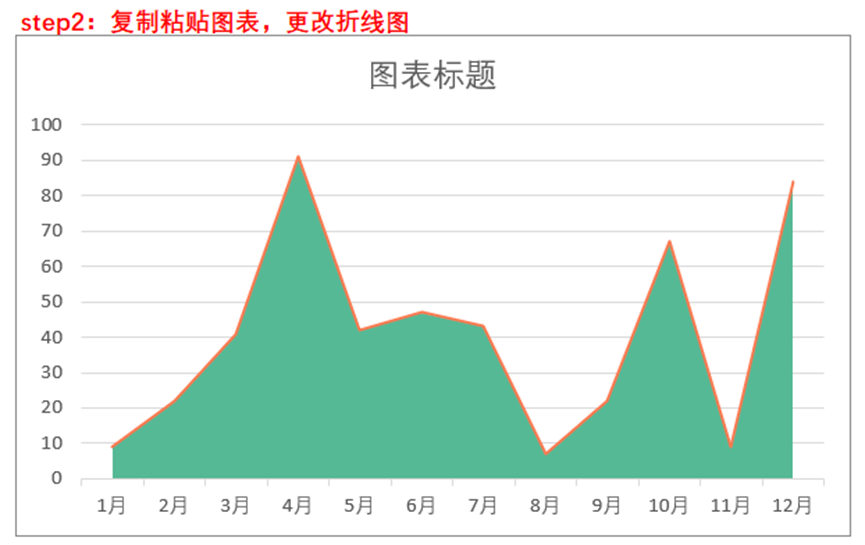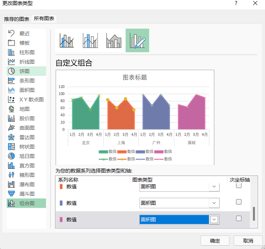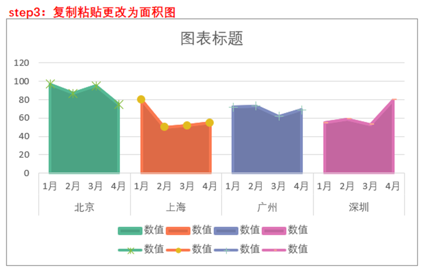 step3:复制粘贴更改为面积图接着ctrl+C复制整个图表,ctrl+V粘贴过来,右键更改系列图表类型种,将后面粘贴过来的4哥系列全部改为面积图。