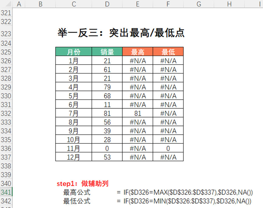step1:做辅助列用if和max/min函数将最大值和最小值标记出来,其余则为na值。