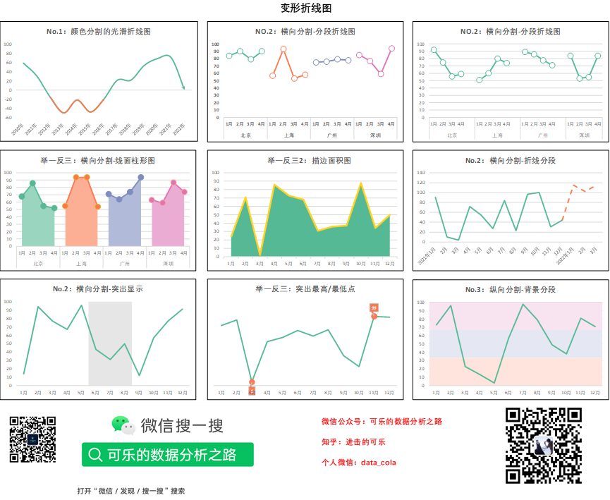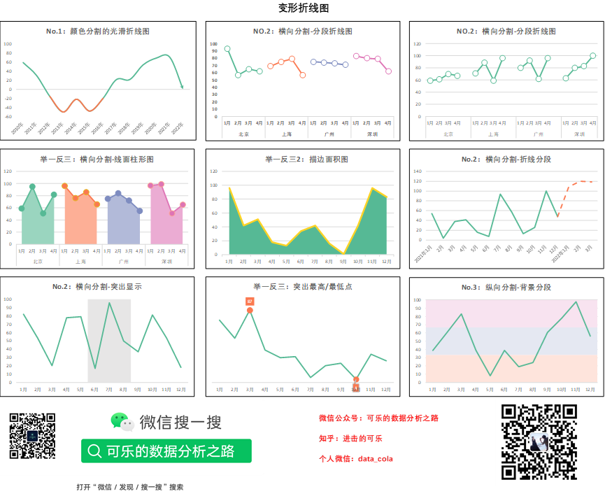 今天带来变形折线图的制作方法和技巧,包括颜色分割、分段、面积图等。主要还是3种思路,即颜色分割、横向分割、纵向分割。