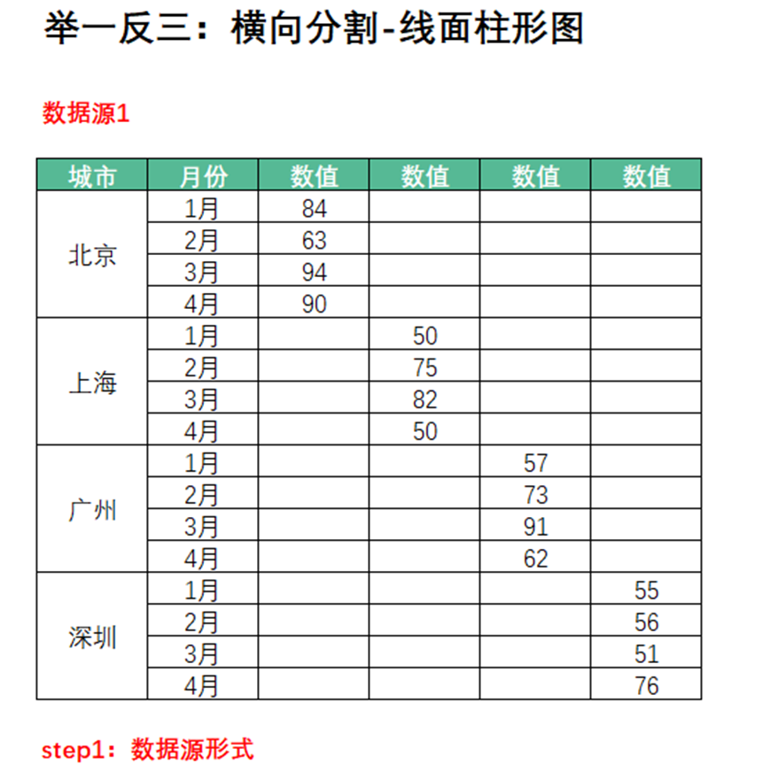 第一种数据源的形式就是我们做横向分割柱形图的数据源,自带空行,就可以起到分割的效果。