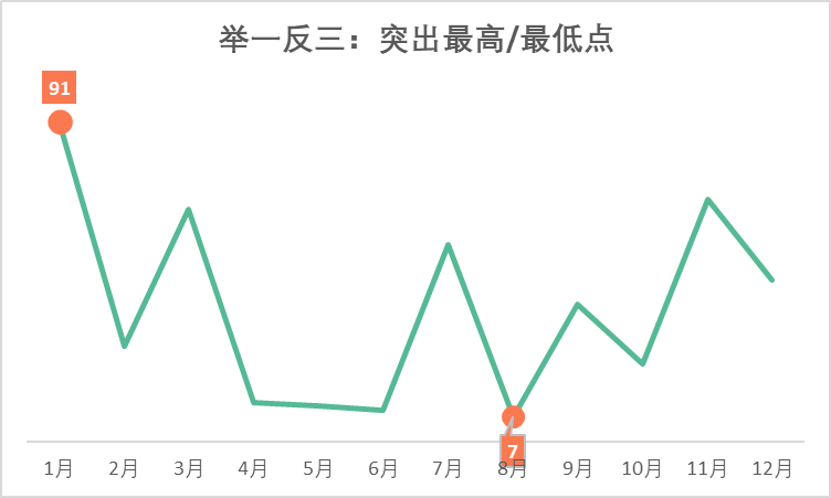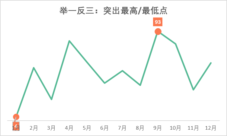 想要做这种把最高点/最低点突出显示出来的图,做两个辅助列,把最高/最低点标记出来再做好微调即可。