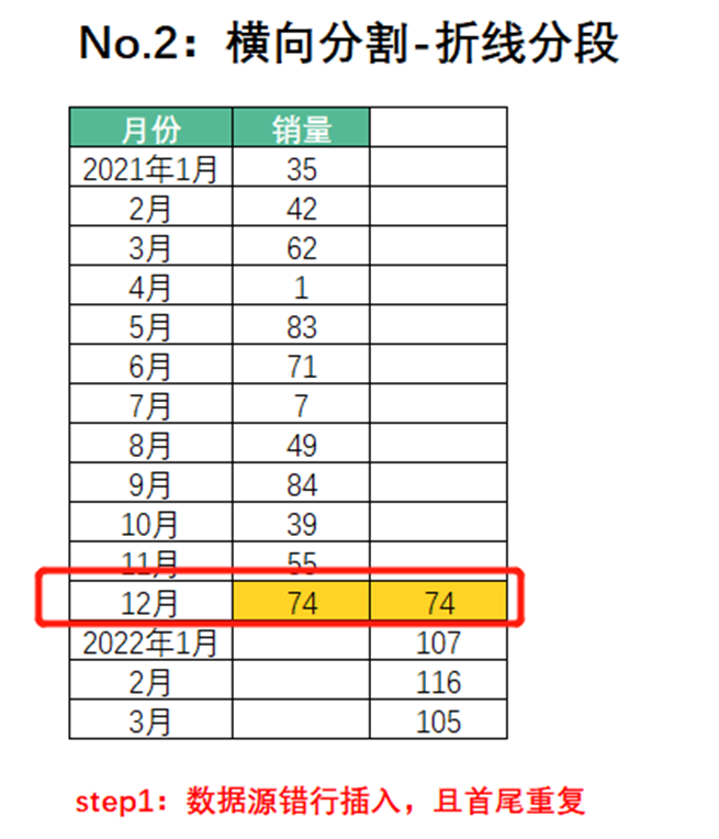 step1:数据源错行插入,且首尾重复要进行虚线表示的数据源和原数据错行插入,且虚线数据的起始数据为原数据的结尾数据,否则制作出来的折线图不连贯。