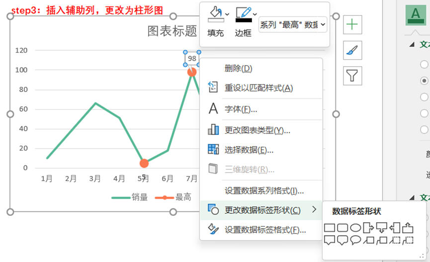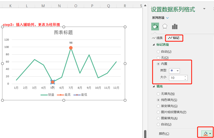 同样低,最高点也是这样操作,只不过最高点要选择为上方。接着,调整最高/最低点的标记类型、大小、填充颜色。