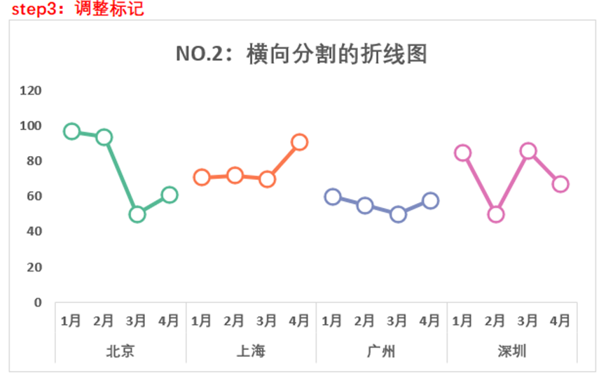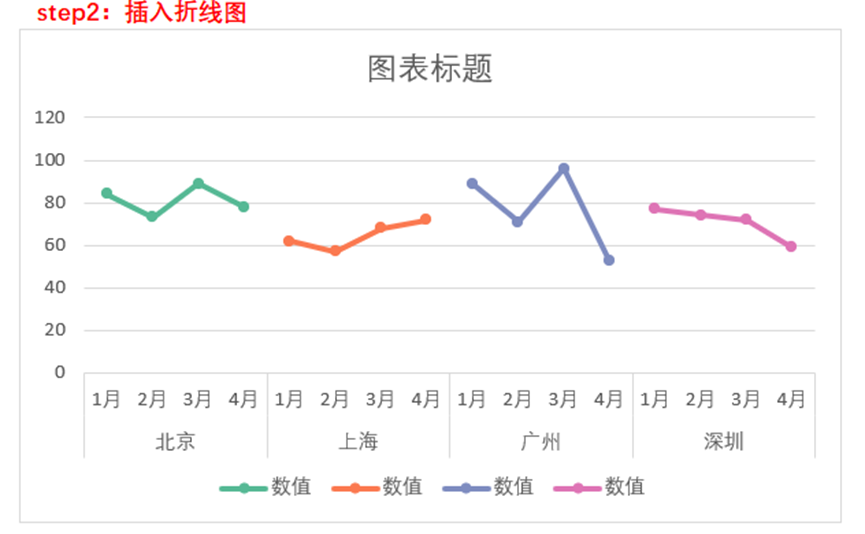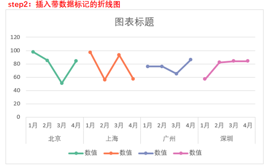 step2:插入带数据标记的折线图直接对数据源插入折线图,横向分割且颜色分类的折线图就完成,后面只需微调即可。