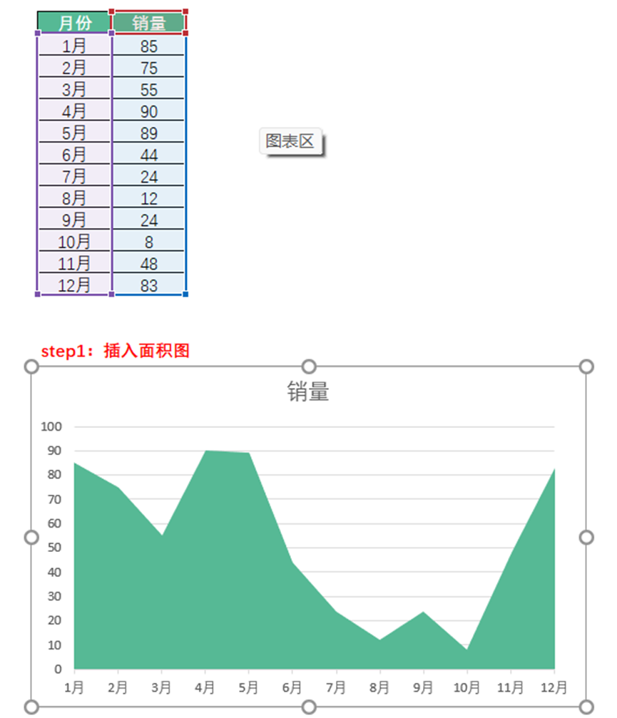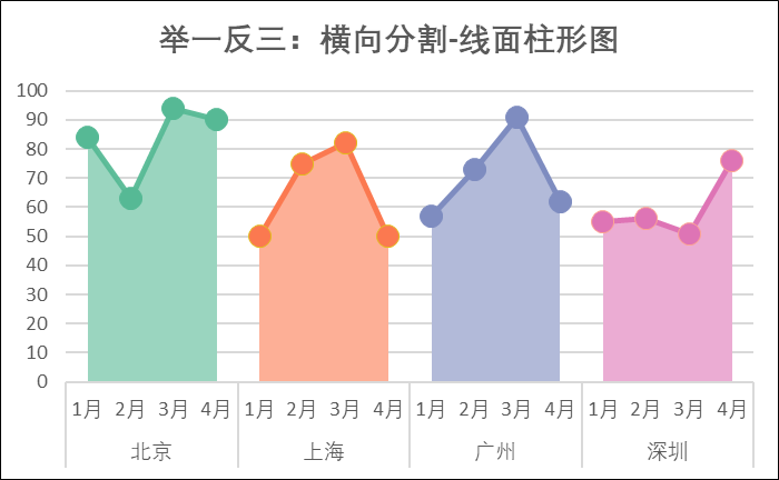 从上面的横向分割折线图,我们也可以举一反三地想到横向分割的线面柱形图。也非常简单,就是在折线图的基础上增加了面积图。
