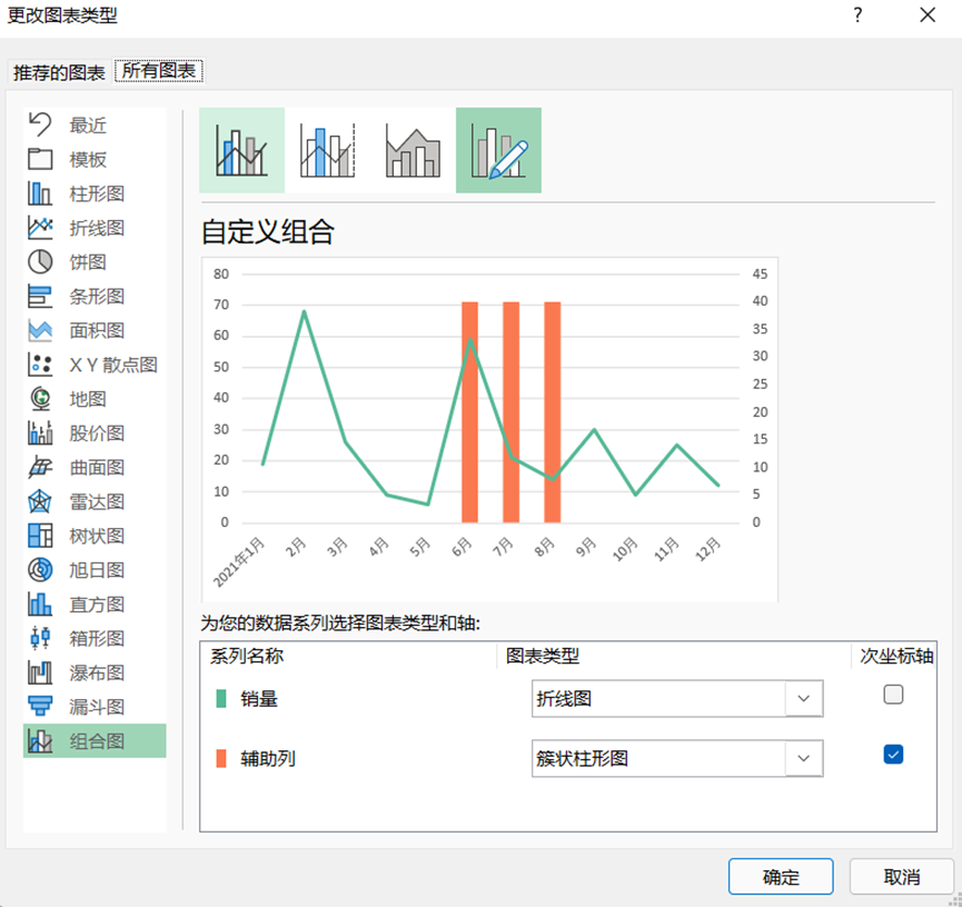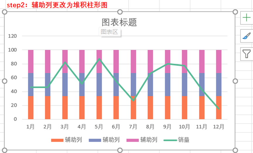 step2:辅助列更改为堆积柱形图插入一个组合图表,销量列为折线图,辅助列为堆积柱形图。