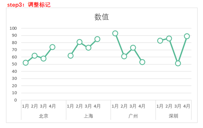 step3:调整标记调整标记点的样式、大小和填充颜色。这种数据源形式作出的横向分割折线图只能是一种颜色的,要想区分颜色需要手动一个一个调整。