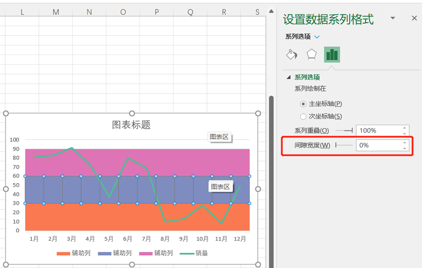 step3:间隙宽度0将堆积柱形图的间隙宽度设置为0,就呈现出了背景纵向分割的效果。