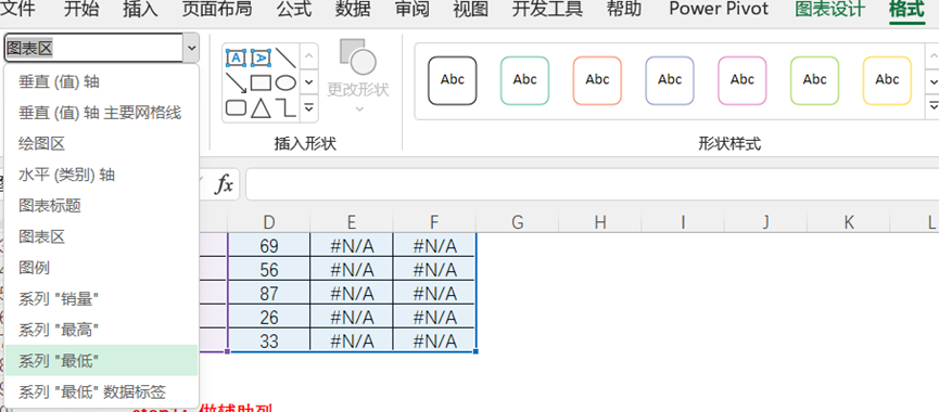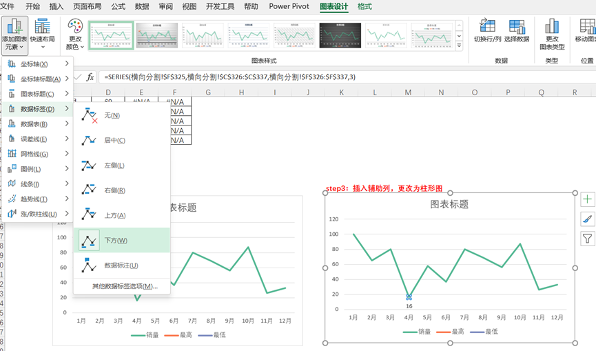 step3:选择最高/最低调整在 格式 选项卡的当前所选内容种,选择 系列“最低“,这样就选择到了最低点,再点击图表设计选项卡,在添加图表元素种,选择数据标签,为下方。