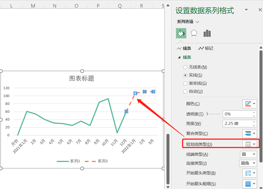 制作这种一条折线分段的图,尤其是当要进行预测时,需要对预测部分用虚线表示。