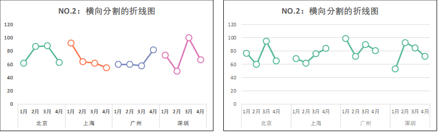 想要做这种横向分割的折线图,思路和横向分割柱形图的思路差不多,先在数据源上下功夫。