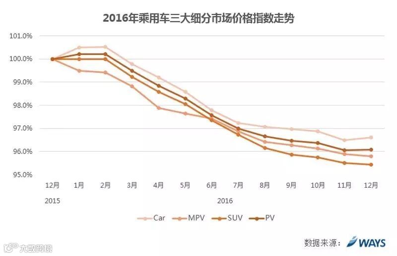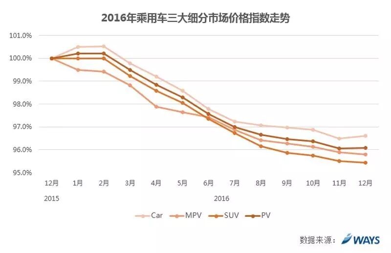 下面小威君要开始放福利了,让大家看看2016年汽车三大细分市场的价格指数走势情况。