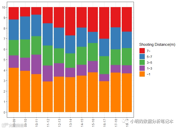 scale_fill_brewer(name="Shooting Distance(m)",palette="Set1",