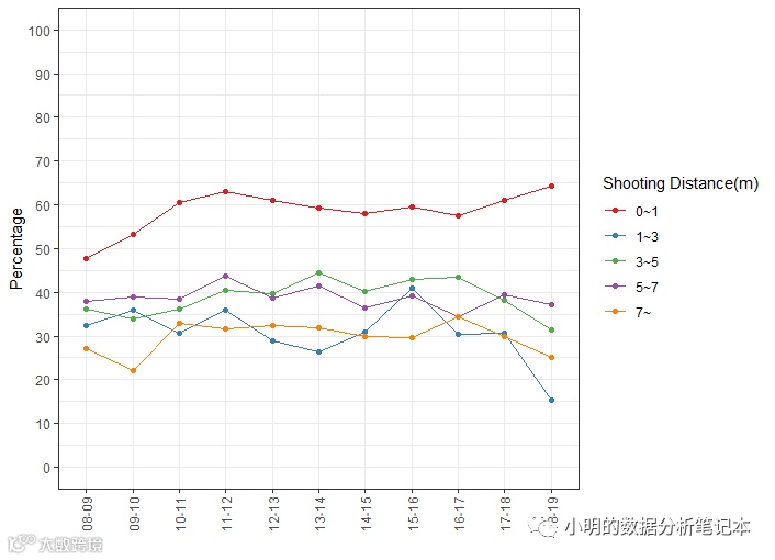 ggplot(mydata1,aes(x=Season,y=Percentage,group=shooting_distance,color=shooting_distance))+