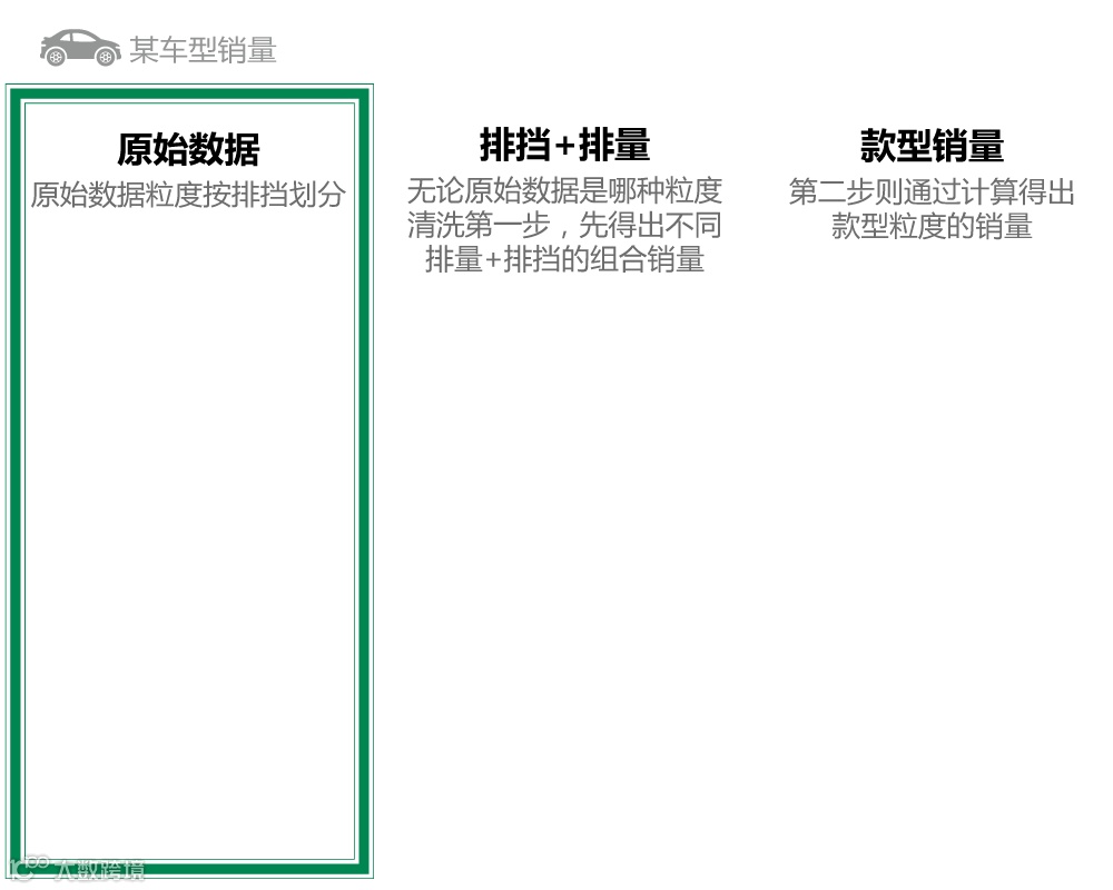 要搞清楚这数据到底怎么“洗”,就得先给大家讲解下车型数据模型,它从粗到细分为不同维度。从销量原始数据的粒度观察,最粗粒度记录在车型,最细粒度有记录在排量+排挡,也有记录在车型+排量,或车型+排挡。这样就会导致数据粒度不一致,继而在应用层面上对数据分析造成很大的阻碍。不在同一起跑线的选手又怎能在同一比赛中公平竞争呢?