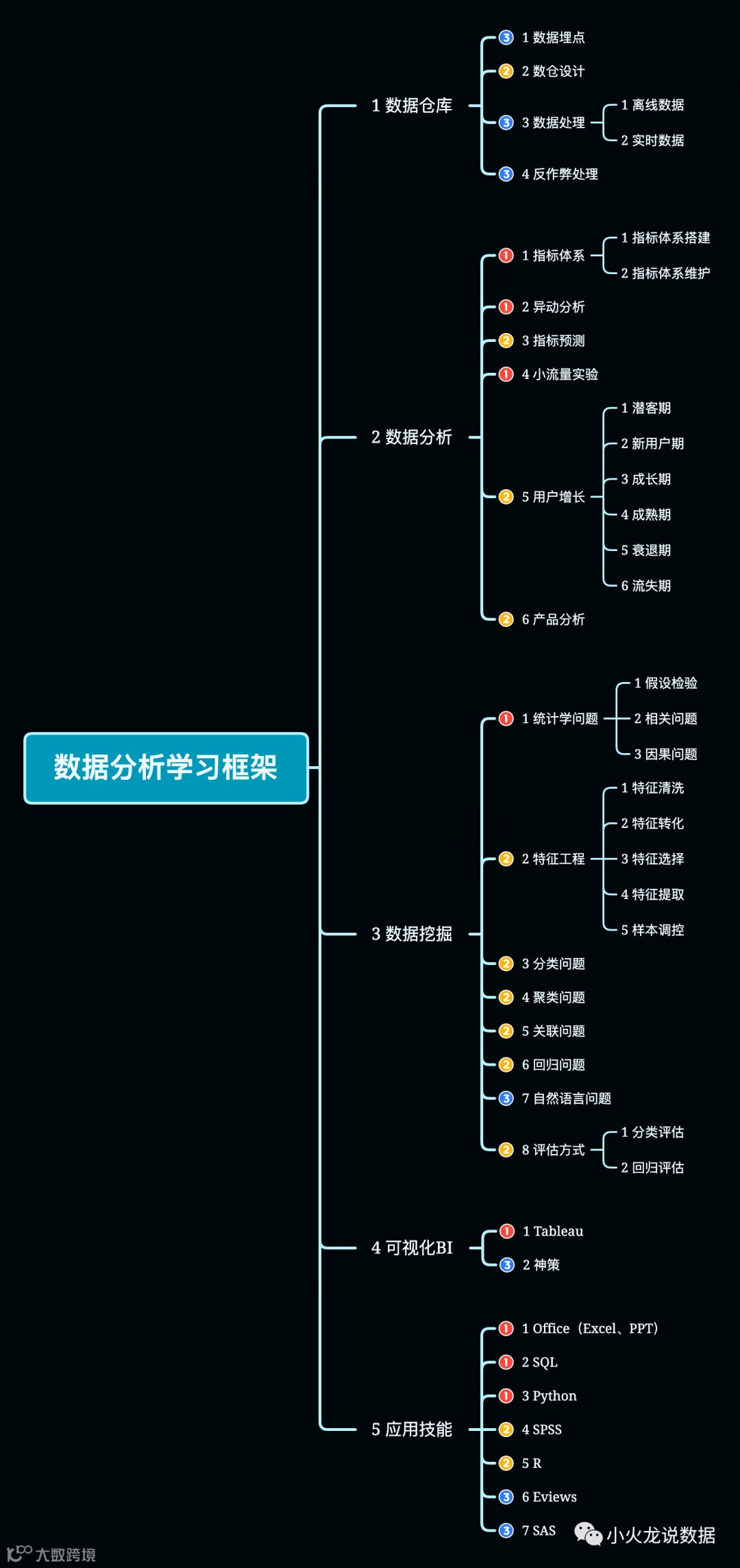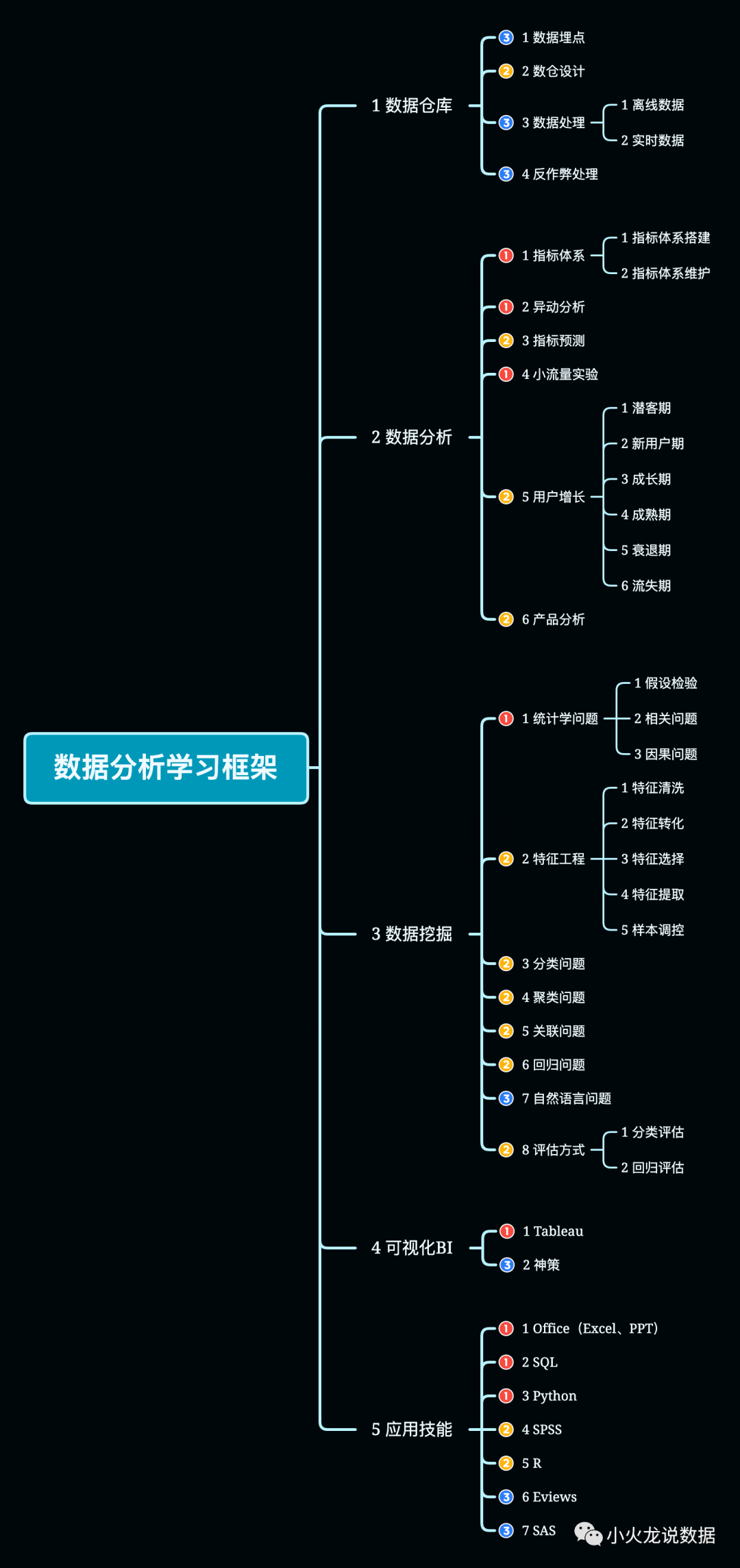 为了解决这样的迷茫,很多同学会选择去搜各种课程、报各种所谓的“N元学会数据分析”、“N天进阶为数据分析专家”等。这些课程鱼龙混杂,其中确有质量较高的课程,但需要去甄别。这里建议大家:不要跟风,多思考,找到属于自己的学习方法。下面,分享给大家小火龙的学习思路,大家可以参考: