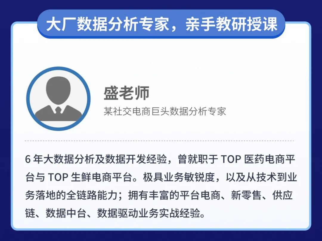本次训练营的授课老师——盛老师,曾就职于TOP 医药电商平台与 TOP 生鲜电商平台,极具业务敏锐度,以及从技术到业务落地的全链路能力;拥有丰富的平台电商、新零售、供应链、数据中台、数据驱动业务实战经验。