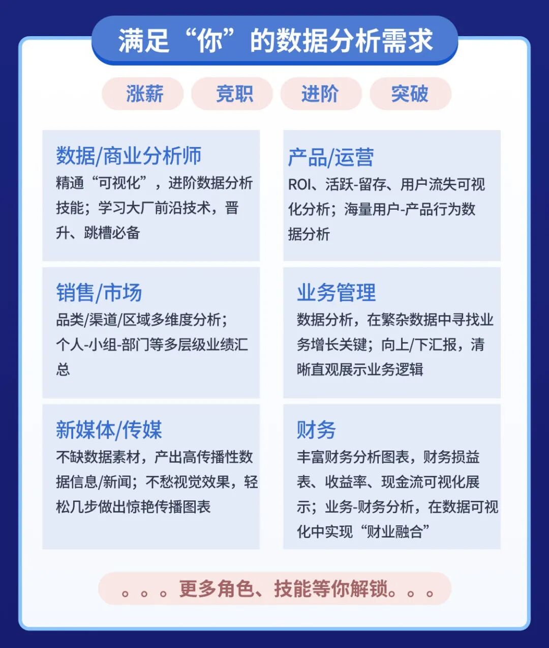 这门课程针对不同人群的需求,深入打磨课程质量。通过学习,你将了解到大厂前沿技术,真正精通"可视化",轻松几步做出惊艳的传播图表,为你的职场晋升添砖加瓦。