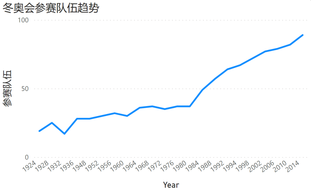 通过折线图中可以看出,参赛队伍自1980后近乎直线增长,至2014年达到最高记录的89个国家(或地区),由于冰雪运动特殊性对比夏季奥运会参赛队伍还是有一定差距(207个)。中国是1980年开始参加冬奥会的。