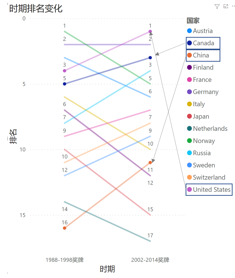 以奖牌总数来衡量的实力榜美国,德国和加拿大是属于前3名(2002-2014),而在1980-1998之间,挪威,德国和美国是前3名。提升显著的加拿大(后面第三部分简单分析加拿大提升原因),同时也关注到中国排名的大幅提升。