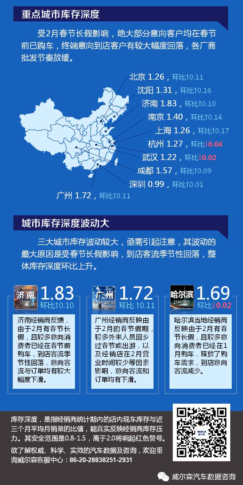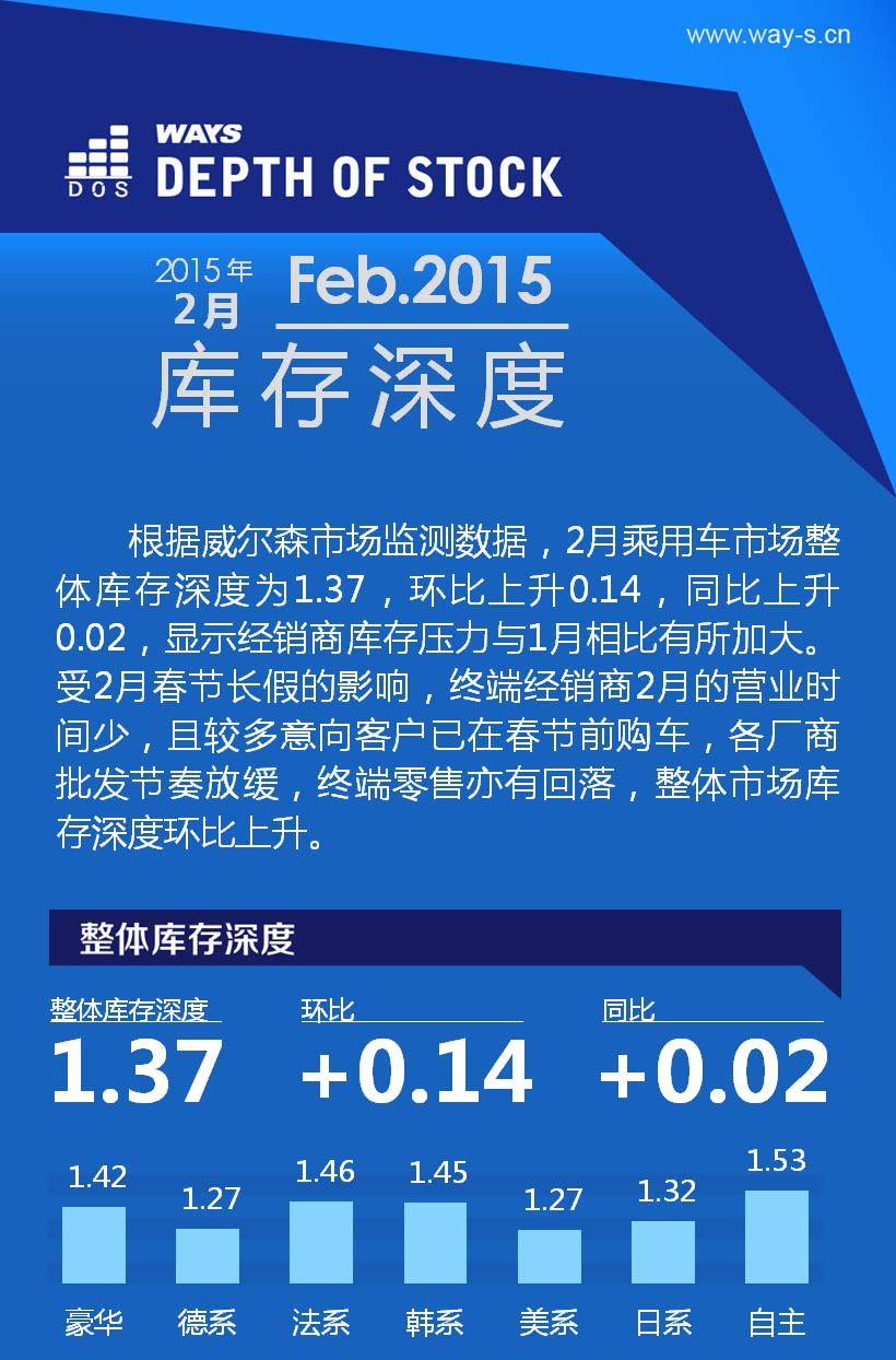 导读:2月乘用车市场整体库存深度为1.37,环比上升0.14,同比上升0.02。