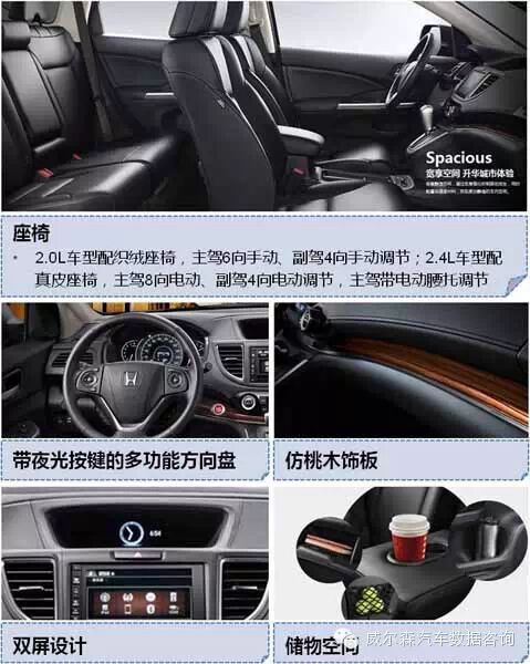 (3)动力系统:沿用老款2.0L发动机,新增源自Honda FUNTEC地球梦科技的2.4L缸内直喷发动机,变速箱升级为CVT无级变速器,标配发动机自动启停和ECON节能辅助系统,综合油耗降低17%,提供两驱和适时四驱可选。