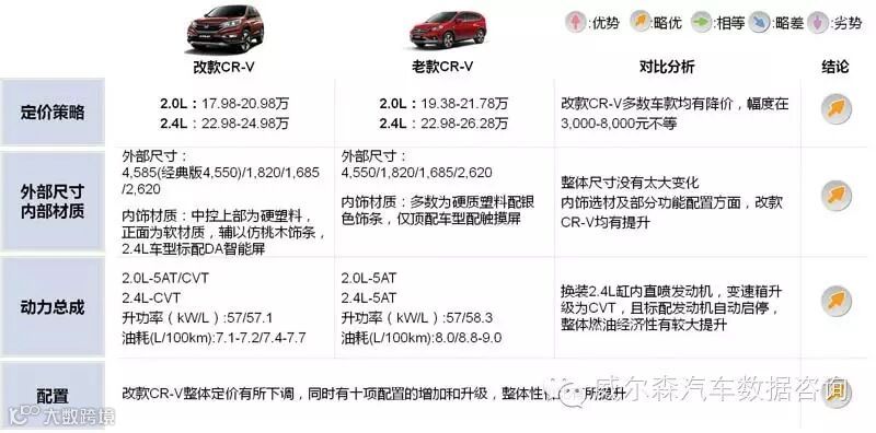 改款CR-V在老款基础上针对前脸细节、内饰材质等方面均有改善,2.4L车型换装缸内直喷发动机,同时标配自动启停,燃油经济性大幅提升,加之配置升级,同时保留一款老款车型作为入门车型,整体性价比有效提升。