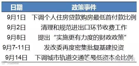 1118月中国宏观经济数据陆续揭晓,虽然投资增速回落,但消费、工业增加值、发用电增速均回升,出口降幅也收窄,中国经济开始出现企稳向好迹象。进入9月份以来,稳增长力度也在不断加码,在半个月的时间里,官方接连出台了若干稳增长措施,涉及住房消费、进出口、财政政策、基建投资等内容。