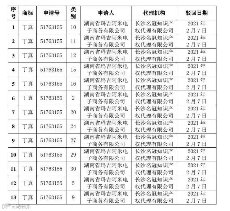 澎湃新闻注意到,上述13件“丁真”商标申请人均为湖南省玛吉阿米电子商务有限公司,代理机构均为长沙名冠知识产权代理有限公司。