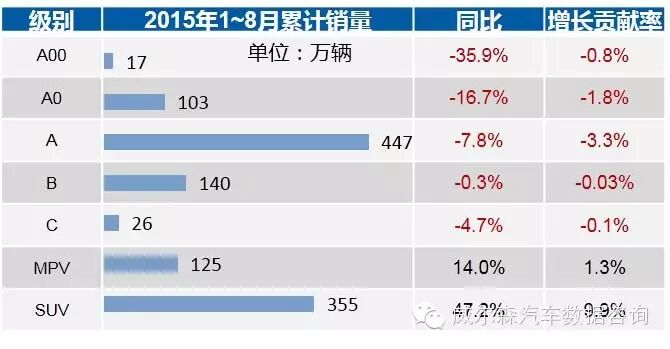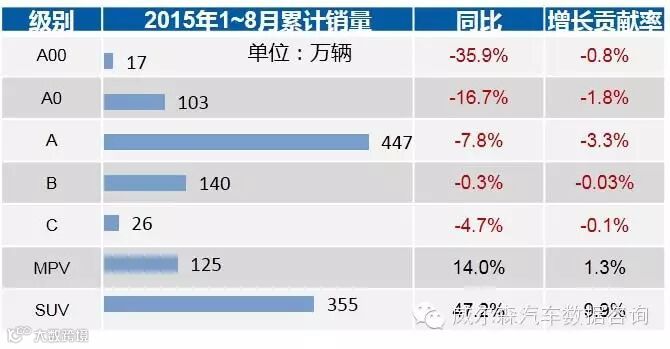 轿车表现疲软,各细分市场均呈下降趋势,其中A级轿车影响最大,其次为A0级;