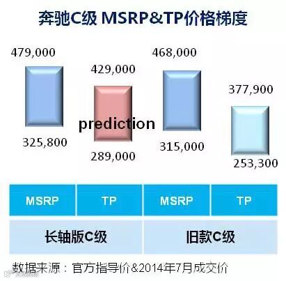 参考旧款C级,C180和C200/260折扣水平相近,但C 180 L的加入,会大幅拉低C级的入门价格,预计长轴版C级15年TP价格段为28.9万-42.9万,折扣率在8%-10.5%。