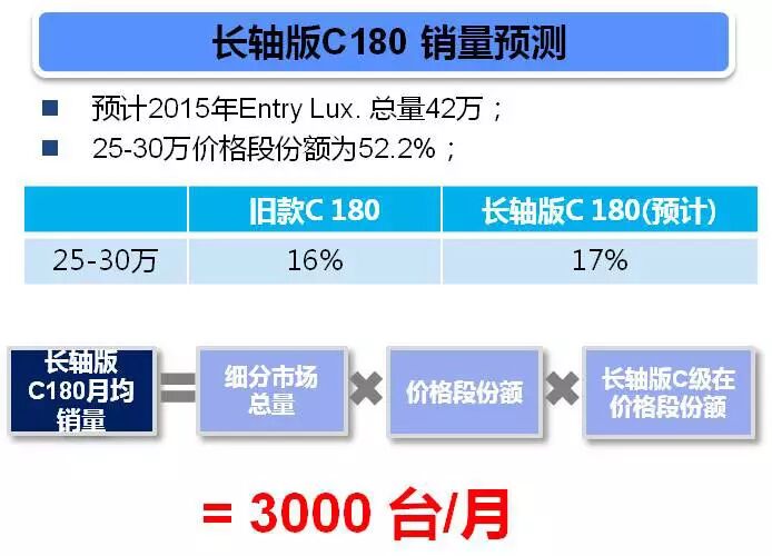 C180 L上市后将成为奔驰C级的主销车型,并主打运动轿车版,抢占30万左右的入门级豪华车市场份额,进一步拉低奔驰C级的入门门槛。并与宝马316li和奥迪A4l 30 tfsi两款同样针对该级别市场的入门车型展开竞争。结合产品自身竞争力与厂家产能后综合预测,该车目标单月销量为3,000台。