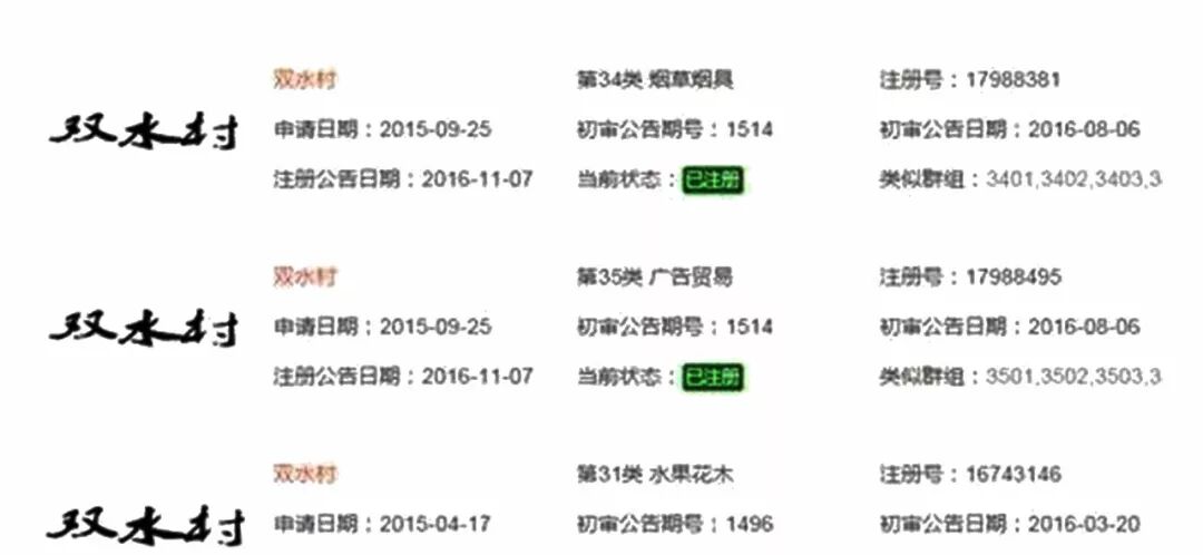 而且,我国《商标法》只规定了县级以上行政区域地名不能注册成商标,并没有说村一级的不能注册。而像双水村这样的热门商标,是很容易做成知名商标、驰名商标甚至是地理标志等。