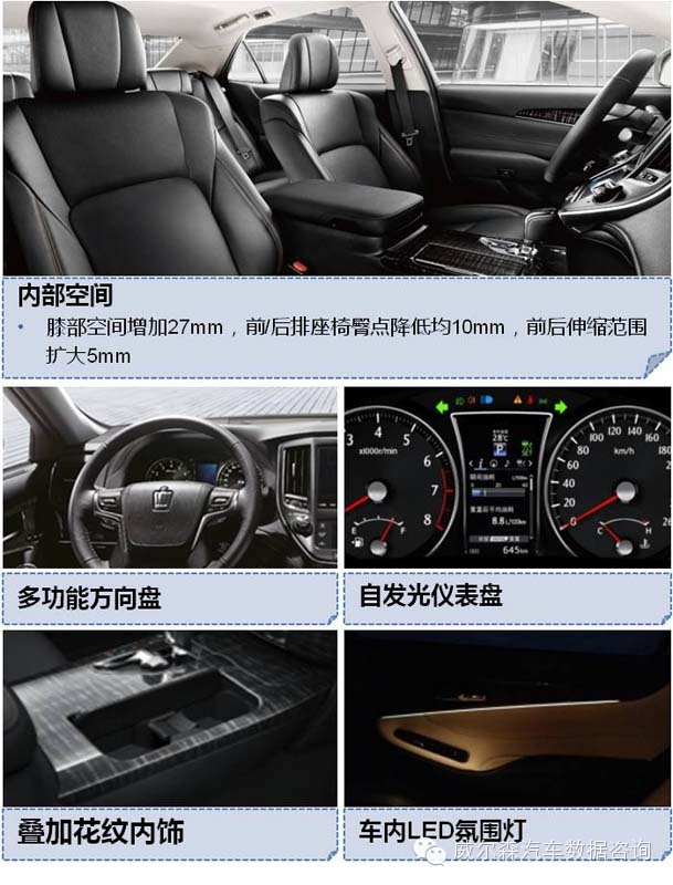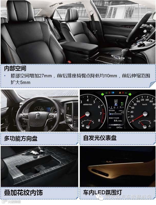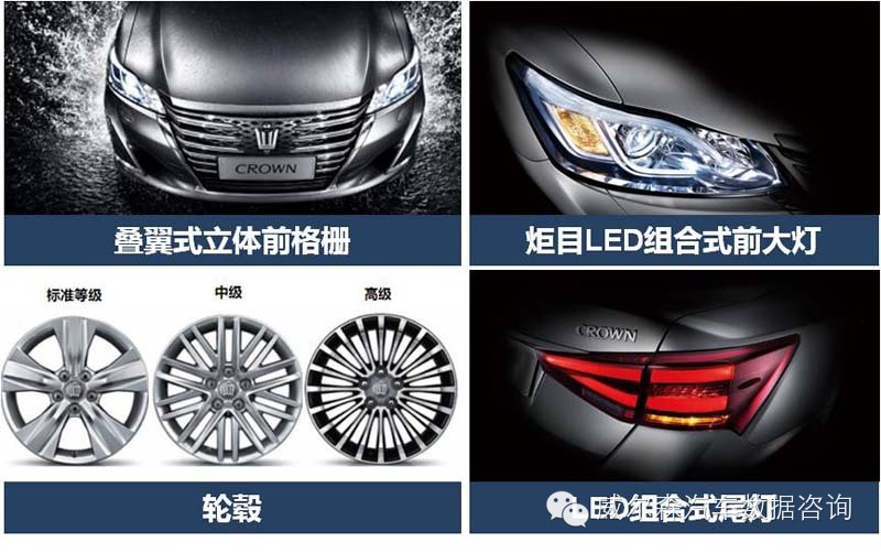 (1)外观:换代皇冠整体设计更加年轻化,尤其前脸改动较大,采用叠翼式立体前隔栅,标配LED光源丰富,包括前大灯、尾灯及日行灯,同时提供三种大小不同造型的轮毂可选,轴距保持2,925mm不变。