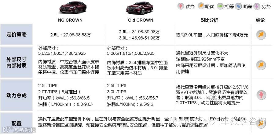 换代皇冠相比老款,外观设计更加年轻化,内饰采用更为简洁的双屏设计,同时新增LED大灯、LED日行灯、盲点监测及全景摄像等科技配置,低配车型定价下调,且后续还将推出2.0T+TIP8的全新组合,整体竞争力大幅提升。