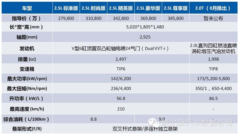 (3)动力系统:搭载调教升级后的2.5L V6 Dual VVT-i发动机,匹配6速手自一体变速箱,燃油经济性有明显改善,且8月份将推出2.0T+TIP8的动力组合,标配多重驾驶模式,高配车型还装备自适应可变悬架系统AVS。
