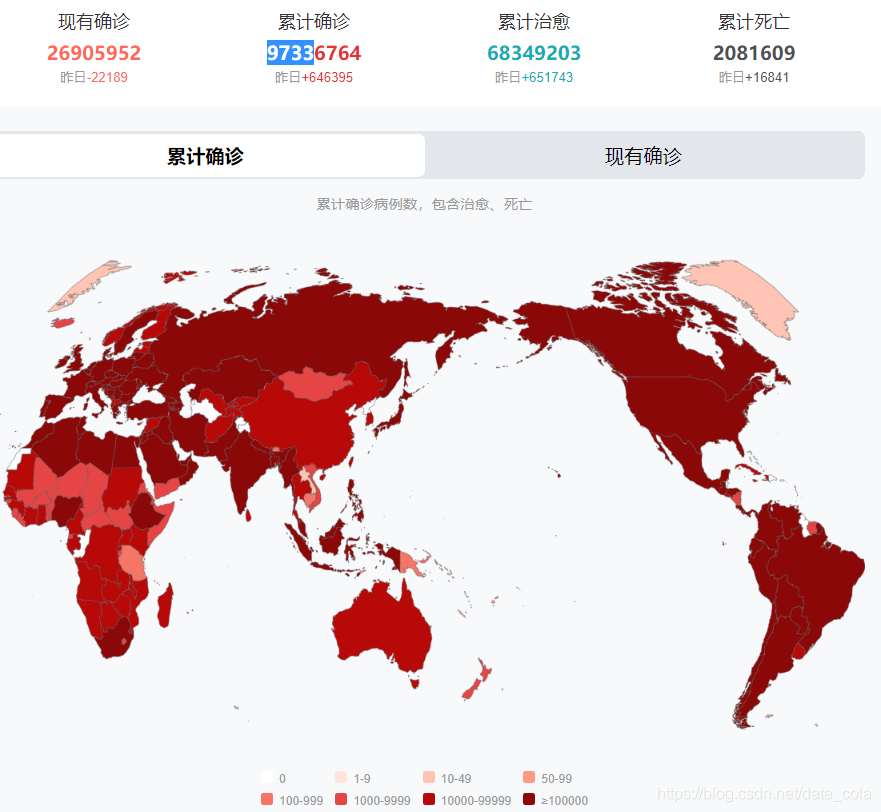 截止2021年1月21日,我国新冠疫情累计确诊99523例,海外累计确诊97336764例。全球累计确诊人数相当于一个埃及的总人口。