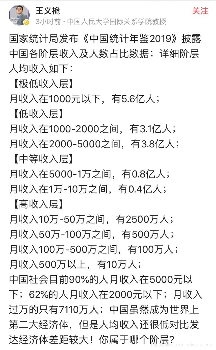 还是根据国家统计局发布的《中国统计年鉴2019》,各阶层收入及人数占比数据,我国有约90%的人月收入在5000元以下,月收入过万的只有5%。