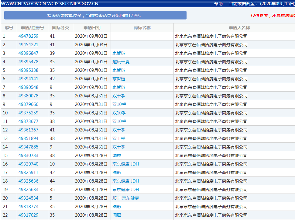 京东一共注册10000多万件,而商标只有45大类,也就是说京东在每个类目上,都注册了相当多的商标。