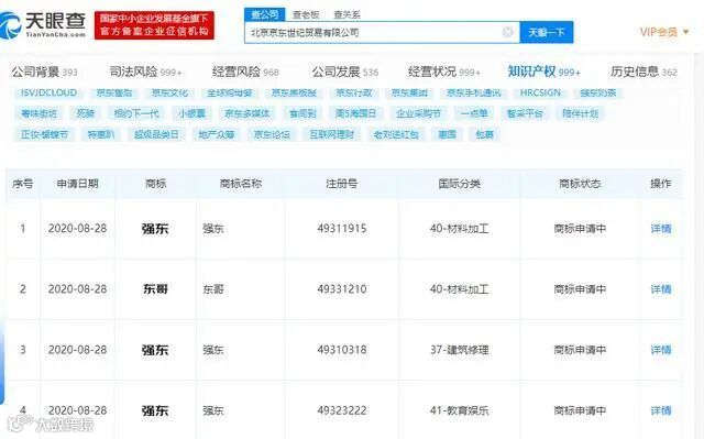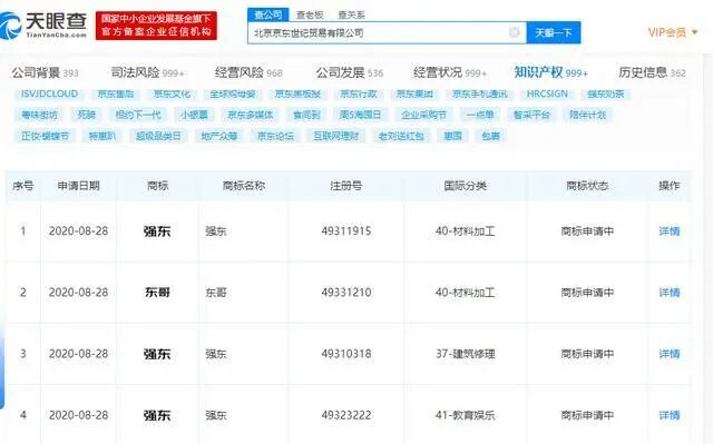 9月16日,天眼查app显示,京东旗下的北京京东世纪贸易有限公司在今年8月28日的时候申请注册了多条商标,其中就包括多条 “东哥”、“强东”的商标。